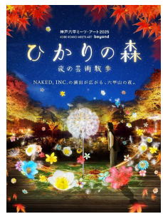 夜間限定の光のアート作品が、ROKKO森の音ミュージアムと六甲高山植物園を幻想的に彩ります。また、会場に設置された作品が光に照らし出され、昼間とは違った表情をお楽しみいただけます。10月中旬~11月中旬には、ライトアップされた木々の紅葉もお楽しみいただけます。