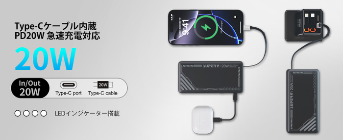 さらに、その見た目からは想像できないほどのパワフルさを秘めています。最大20W出力に対応し、内蔵Type-Cケーブルおよび本体のType-Cポートは最新のPPS、PD3.0、QC3.0といった急速充電規格に対応。これにより、スマートフォンやタブレットをスピーディーに充電できます。また、内蔵ケーブルと本体Type-Cポートを同時に使用することで、2台のデバイスを同時急速充電することも可能で、充電の順番待ちから解放されます。