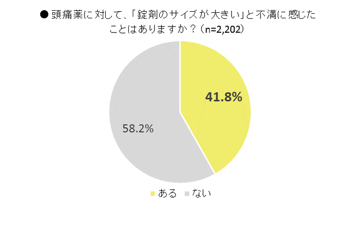 さらに、解熱鎮痛薬の服用性に関する質問を実施したところ、「錠剤のサイズが大きい」と不満に感じたことがある方の割合は41.8%でした。また、このうち89.0%の方が「錠剤が飲みづらい」と感じており、錠剤が大きくて飲みづらいと思っている方が多いことが分かりました。