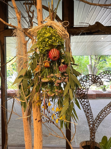 フラワーアレンジ教室では、近年人気の高まっているスワッグ(壁飾り)についてその歴史や意味を学び、南半球のワイルドフラワーをふんだんに使用した華やかなスワッグの製作に取り組みました。