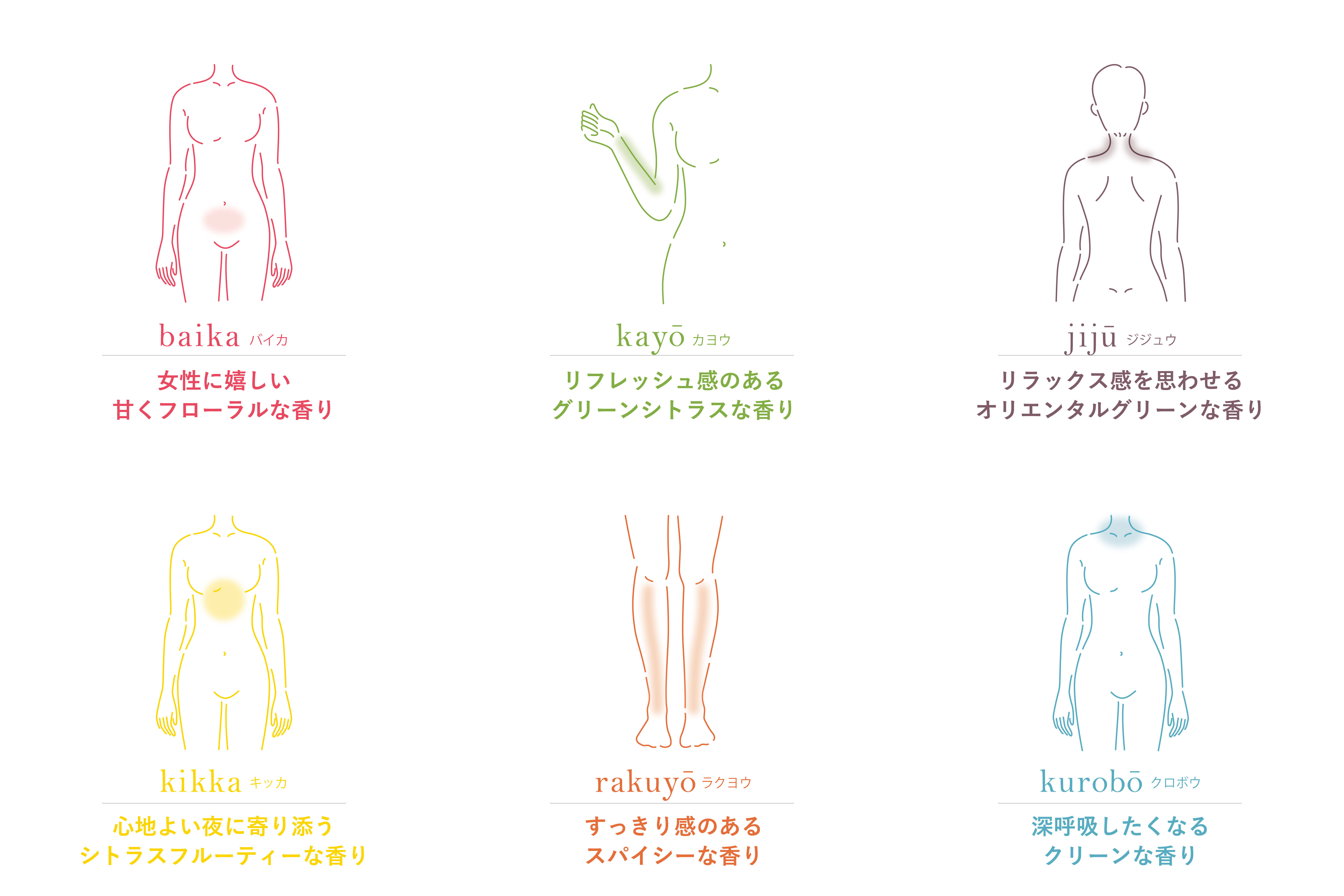 香り別に、オイルを塗る部位や、使用量、使い方をご紹介しています。