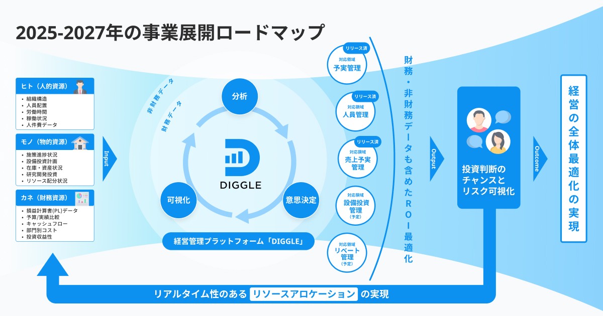 DIGGLE株式会社は、企業の「ヒト」「モノ」「カネ」の最適配分を実現する経営管理のためのオールインワンサービスの提供を目指しています。「DIGGLE予実管理」(「カネ」の領域)から事業をスタートし、2025年4月には「DIGGLE人員管理」(「ヒト」の領域)をローンチしました。経営環境の変化に合わせて常にリソースの最適配分を実現するためには、全社で目線をそろえた管理体制づくり・社内コラボレーションが重要だという一貫した考えのもと、プロダクト開発を行っています。今後もリアルタイムな「ヒト」「モノ」「カネ」のリソースアロケーションを実現する事業開発・既存プロダクトのアップデートを行い、企業の持続的な成長・競争力強化に貢献してまいります。
