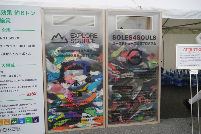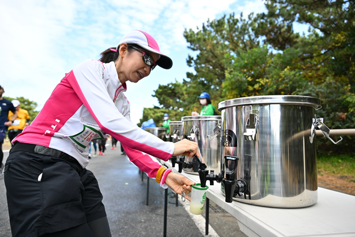 また、コース上には、ランナーにエコマナーアップを呼び掛けるエコ・ランナー、最後尾手前でコース上に散らかったゴミを拾うエコ・スイーパーが参加。そのほか、リサイクル・リユースできるTシャツ・シューズの回収BOXの設置や、地元の銘菓がズラリと並んだ給食所も。無事大成功に終わった世界初の“マイボトル”マラソン大会。ぜひ今後もご注目ください。