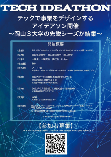 岡山大学イノベーションマネジメントコア(IMaC)ベンチャー支援フィールドは、岡山大学・岡山県立大学・岡山理科大学の先鋭シーズが結集するテックアイデアソンを開催します。