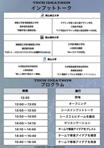 今回のテックアイデアソンでは、登壇いただく岡山3大学の先生が自ら磨き上げた先鋭技術をシーズとして捉え、参加者のみなさまの自由な発想力で事業アイデアの創出にチャレンジしていただきます。