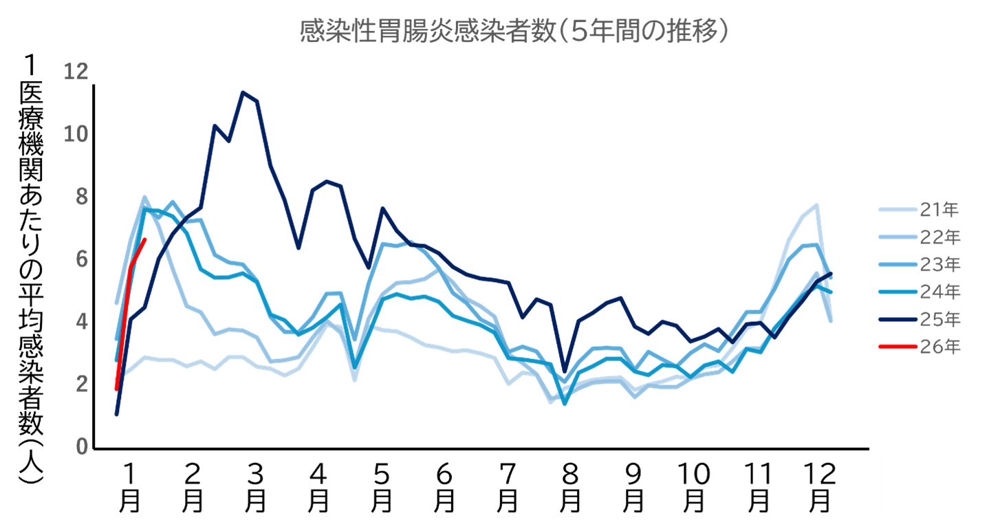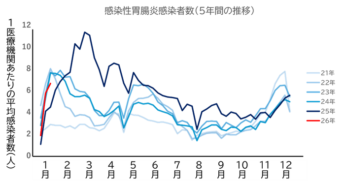 ・昨年は2月中旬から5月にかけて、感染性胃腸炎が増加。