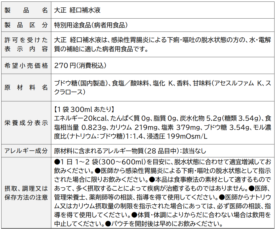 医師から感染性胃腸炎による下痢・嘔吐の脱水状態として飲用を指示された際には、「大正 経口補水液」の飲用がおすすめです。「大正 経口補水液」は、感染性胃腸炎による下痢・嘔吐の脱水状態の方の、水・電解質の補給に適した病者用食品です。