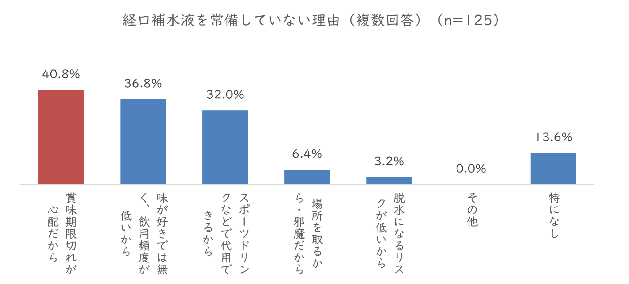 ・経口補水液を常備していない理由は、「賞味期限切れが心配」「味が好きではなく、飲用頻度が低い」など。