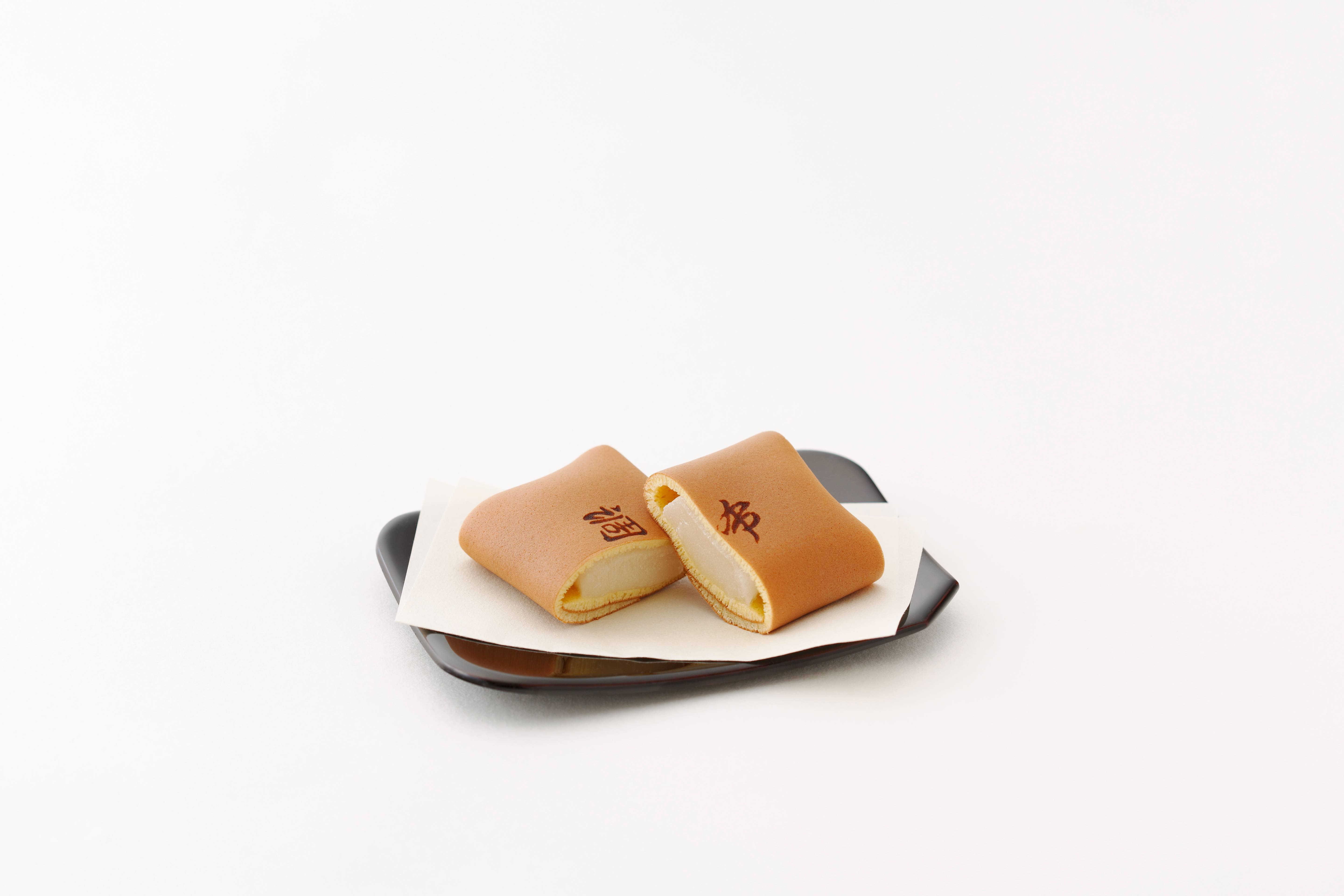 「調布」は、しっとりとしたカステラ風の生地で柔らかな求肥を包み込んだ和菓子です。見た目は細長く、まるで薄絹を重ねたような上品な姿。ひと口頬ばると、香ばしい生地ともちもちした求肥の食感が調和し、やさしい甘みが広がります。
