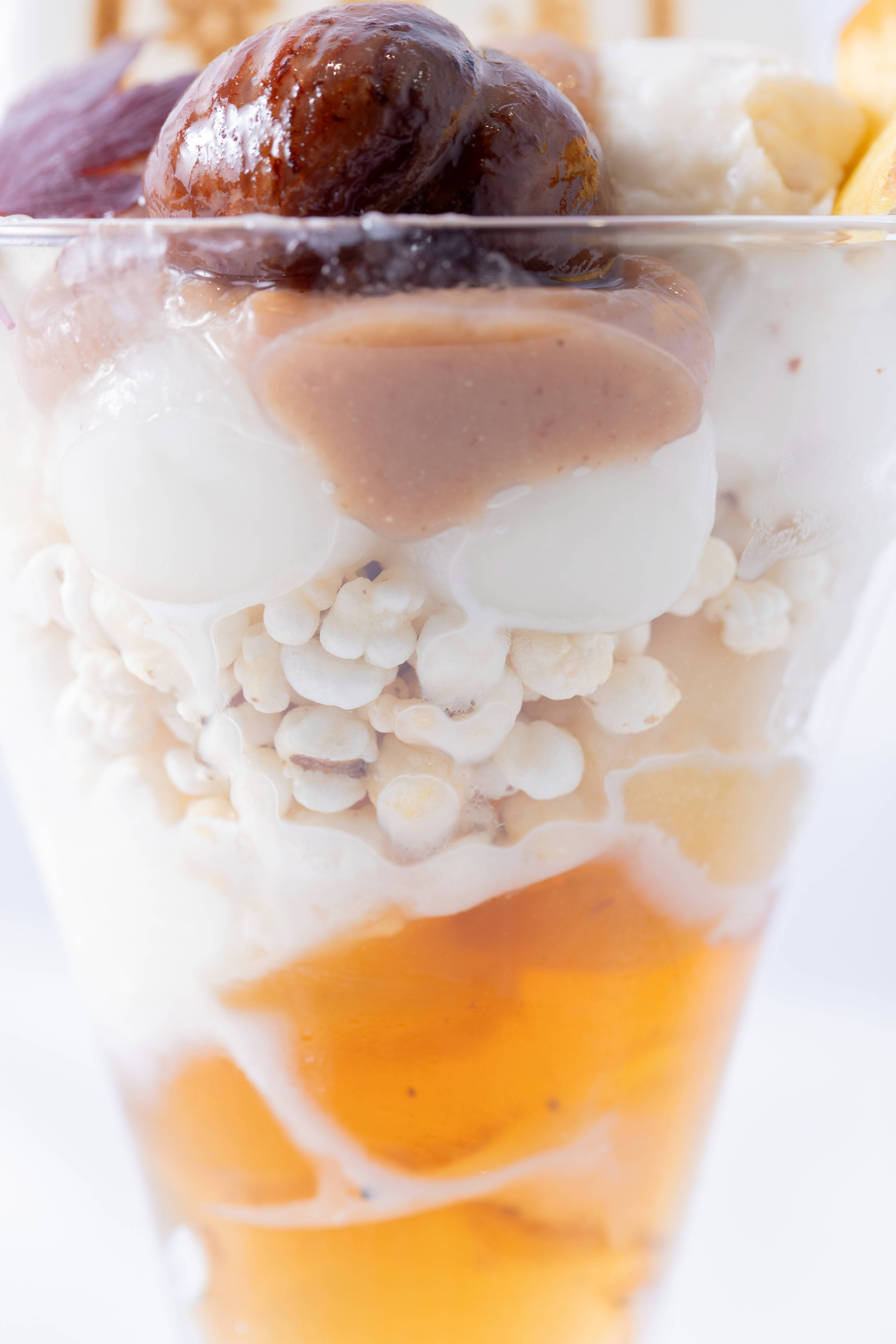 パフェは、濃厚なマロンクリームや香ばしい渋皮栗、和栗のアイス、芋餡、ほうじ茶ゼリー、バニラアイス、白玉など、京都の秋の実りを贅沢に詰め込んだ層構成。永楽屋特製のふやき煎餅やお芋のチップス、はと麦ほうじ粒が食感にアクセントとなり、和と洋が調和した上品な甘さが広がります。
