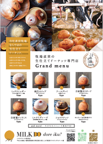 当ブランドは北海道美深町に研修機能も兼ね備えた牧場、札幌エージェントファームに依頼した生乳を使用し、北海道の第一次産業の発展と6次産業化に貢献することを目標としております。また北海道内企業同士のアライアンスを組み、生産→加工→販売まで一貫を実現。より安く、より早く、鮮度が高い商品を提供できます。また生産から販売まで顔が見えるため、お子様からご高齢まで安心安全に『ミルクドドレイク』の生ドーナッツをお楽しみになれます。