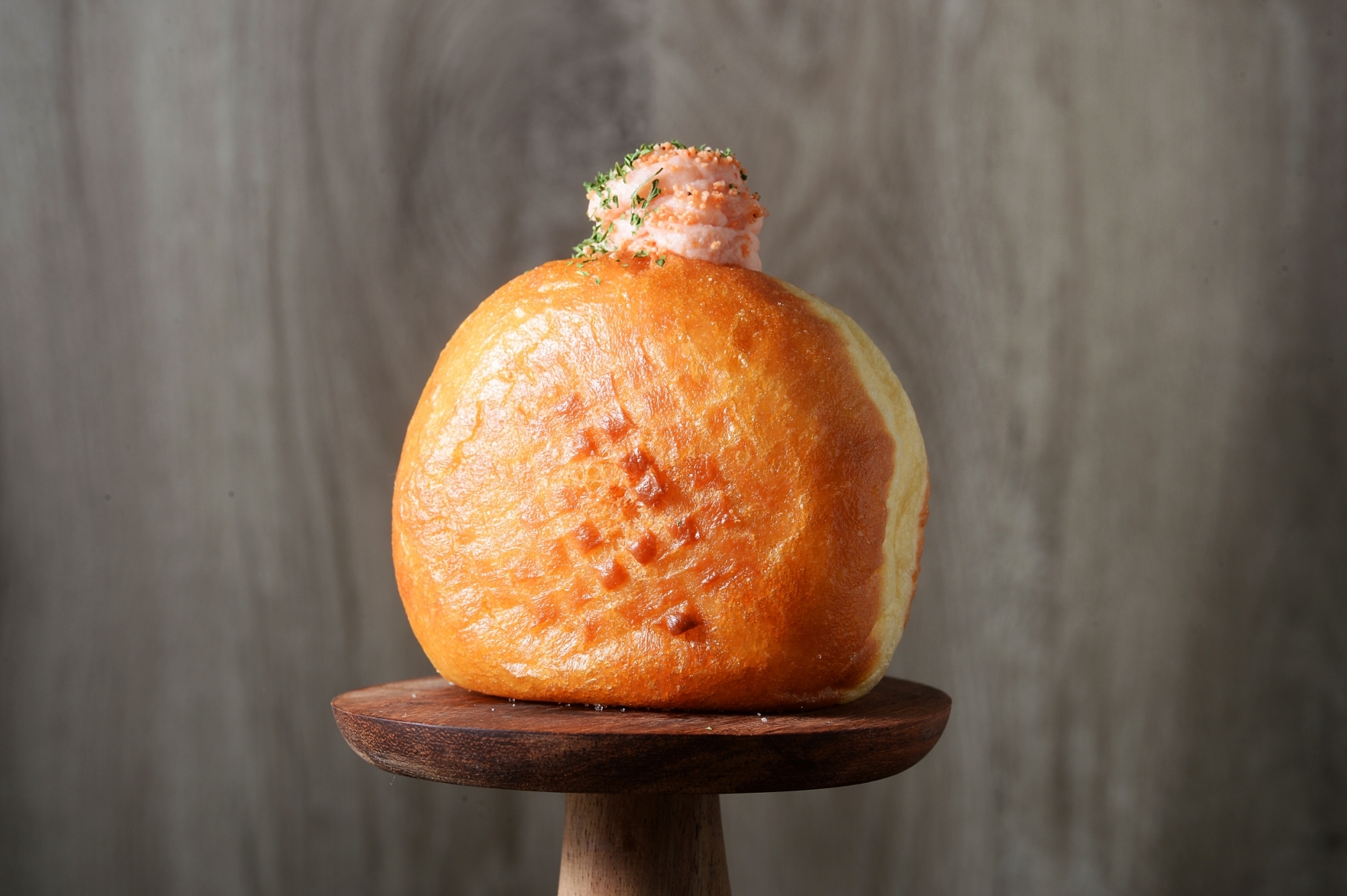 通常メニューでは姪浜店だけしか買えない、「めんたいこ&北海道ポテト」350円も販売。北海道産のじゃがいもを北海道産の明太子で和えたポテトサラダで、程よい辛味が癖になる惣菜生ドーナッツです。