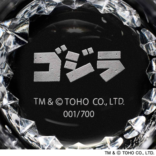 深淵なる闇を漆黒の色被せ硝子で表現し、艶めくその表面に世界を震撼させたゴジラの威容が、昔ながらの「手切り」や精妙なサンドブラストを尽くして刻まれました。