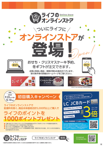 ライフのオンラインストアで配達料を除く、商品本体価格合計5,000円以上ご購入でライフのポイント1,000ポイントをプレゼントする初回購入キャンペーンを12月10日(水)まで実施しております。キャンペーン期間中は、「おせち」「クリスマスケーキ」「冬ギフト(10月中旬受付開始)」をご注文いただけます。この機会にぜひ、ライフのオンラインストアをご利用ください。