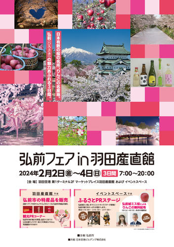 青森県弘前市では、日本有数の桜の名所である弘前公園の桜と、日本一の生産量を誇る弘前りんごをPRし、更なる誘客を促進するため、羽田空港第1ターミナルにおいて2024年2月2日から2月4日までの3日間限定で、弘前観光PRブースの設置や特産品の販売などを行います。
