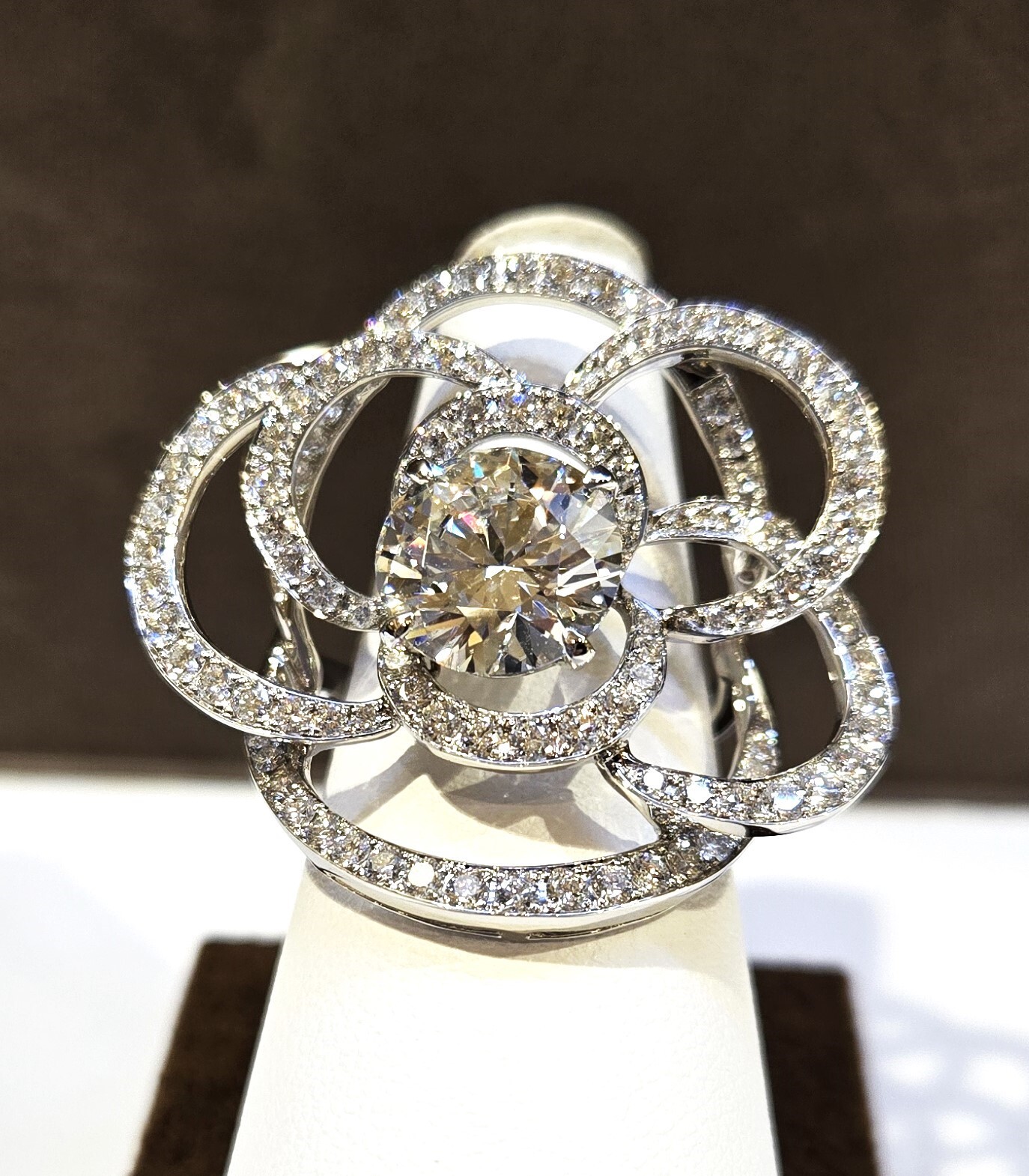 ダイヤの総合計が5カラット以上と、とてもボリュームのある華やかなデザインリング。
