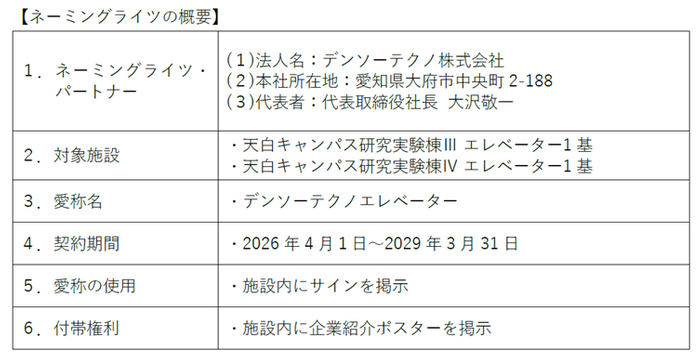 対象施設は、天白キャンパス研究実験棟Ⅲのエレベーター1基、研究実験棟Ⅳのエレベーター1基(以下、「本施設」)で、2026年4月1日から2029年3月31日まで本施設の愛称は「デンソーテクノエレベーター」となります。