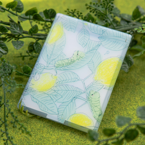 レモンの葉をむしゃむしゃと食べているアゲハチョウの幼虫をモチーフにしたイラストはフレッシュでほっこりした気持ちにさせてくれます。新生活を迎える方へのギフトにもおすすめです。