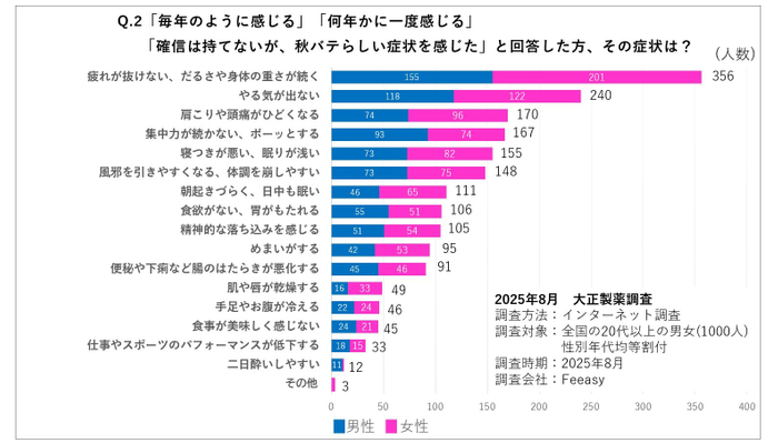 大正製薬が2025年8月に全国の20代以上の男女1000人を対象に行ったインターネット調査によると、約6割(59.1%)の人が、少なからず“秋バテ”の症状を感じていることがわかりました。
