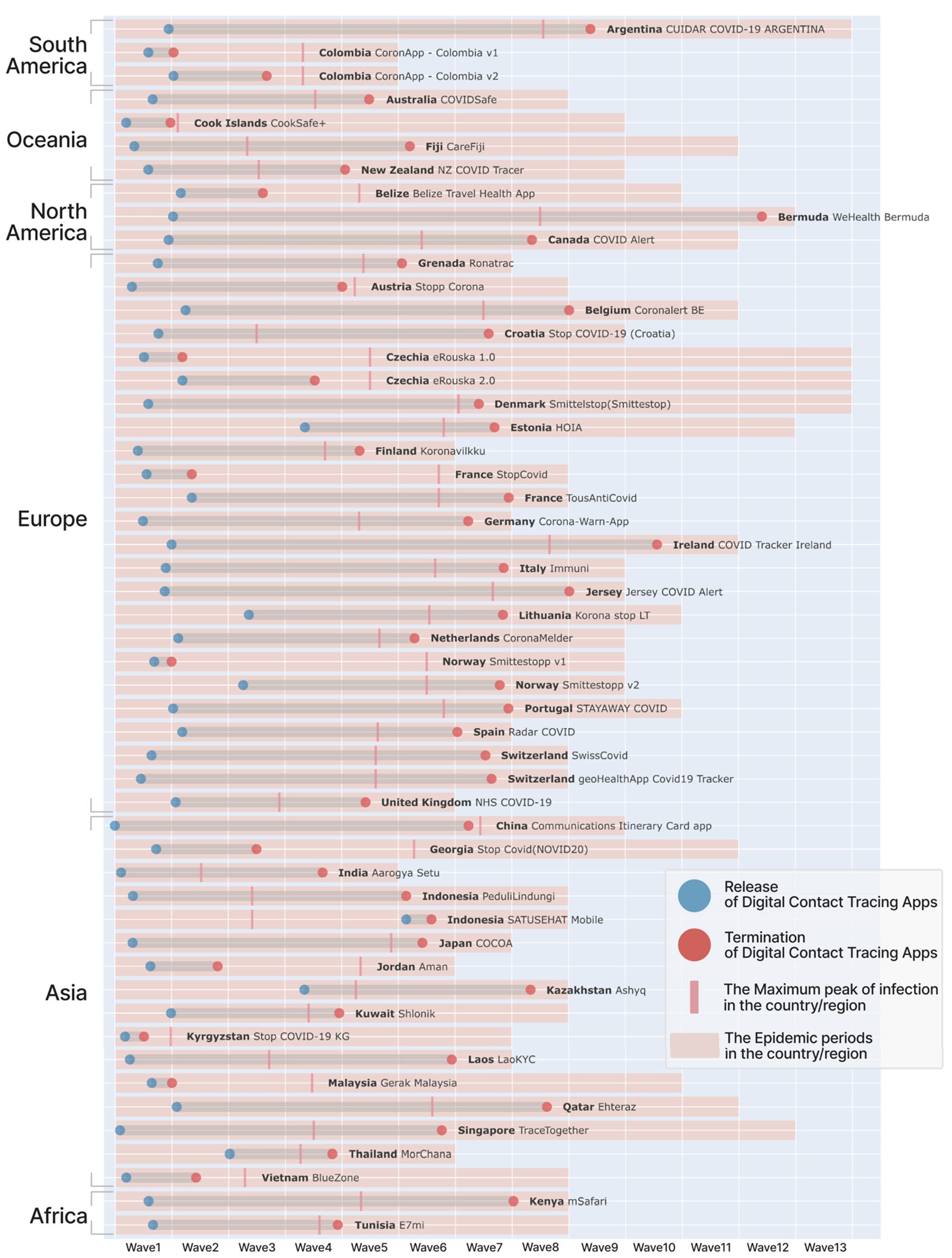 新型コロナウイルス感染症によるパンデミックにおいて、各国はデジタル接触確認(Digital Contact Tracing: DCT)アプリを導入しました。これらは新たな感染対策技術として期待されたものの、感染抑制には有効でなかったという評価もあります。一方で、国によっては、ある程度有効であったという評価も示されています。日本で導入された COCOA は患者の全数把握が終了した 2022年末に終了しましたが、もし接触確認技術が感染抑制に有効なのであれば、改良したうえで運用を継続する選択肢は無かったのでしょうか?この問いに答えようとしても、そもそも、世界各国において導入されたこれらのアプリが、どのように運用を継続し、あるいは終了したのかについて、網羅的な調査は存在しませんでした。