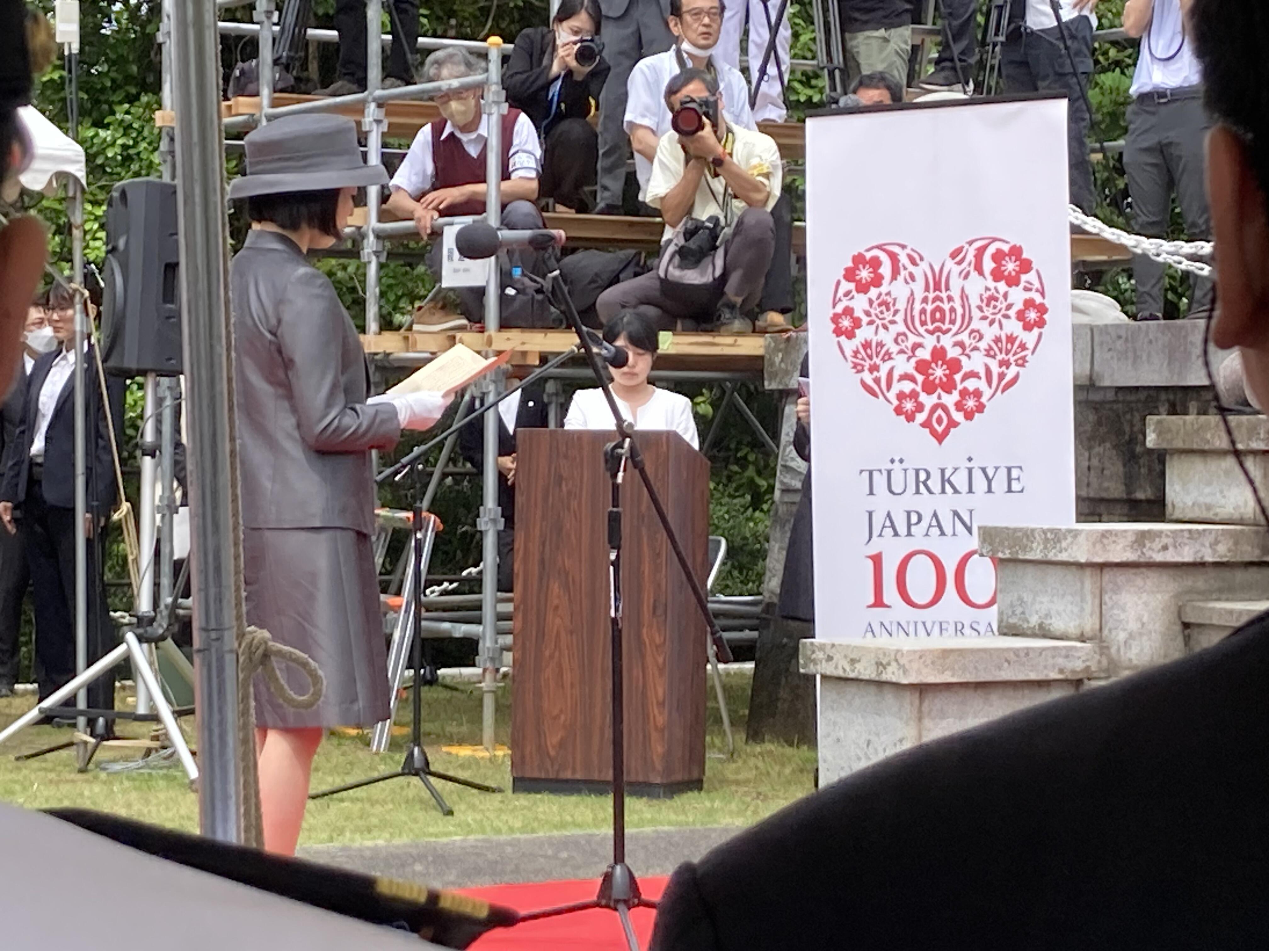 エルトゥールル号は1890年9月16日、明治天皇への表敬訪問を終えて横浜港からの帰途、嵐に遭遇して座礁し沈没。乗組員587人が犠牲になりましたが、地元・樫野の住民たちの懸命の救助で69人が助かりました。生存者の帰国や慰霊碑の建立など犠牲者の追悼に尽力したことから、その後の日本とトルコの友好関係の原点と言われています。追悼式典は、今年が両国の外交関係が樹立されて100年となるのを記念して開催されました。