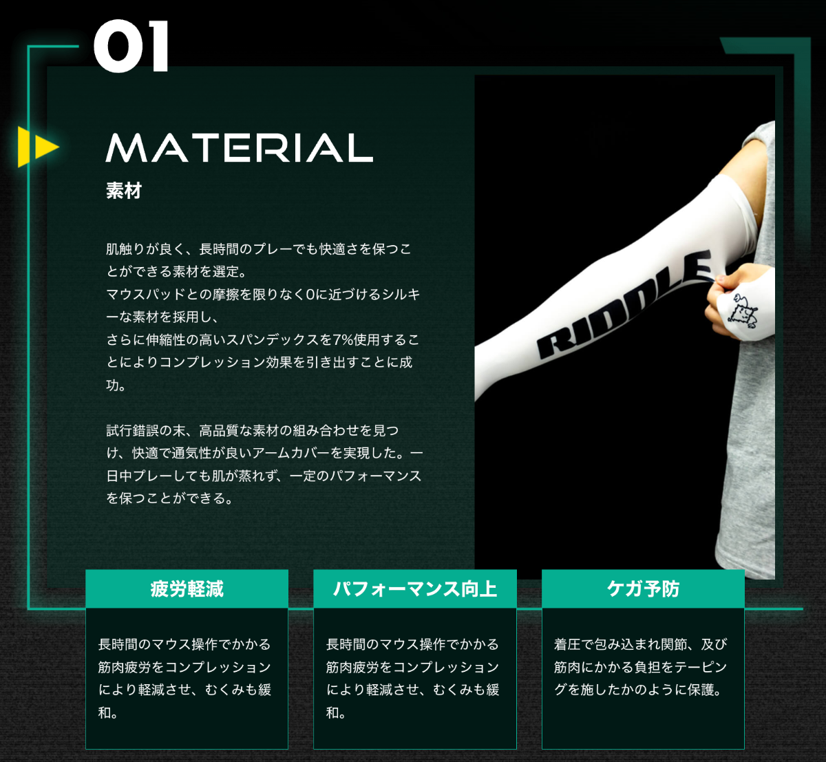 RIDDLEとの共同開発により、理想的なゲーミングアームカバーが完成しました。試行錯誤の末、最高の肌触りを実現し長時間のプレーでも快適さを維持します。多くの人の体型にぴったりフィットしサイズ感も良く、縫い目を排除したシームレスなデザインでマウスパッドとの摩擦を徹底的に抑えることによりマウスの操作性を飛躍的に向上させました。