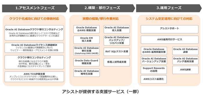今回アシストが提供開始する「Oracle Database@AWS導入支援サービス」は、「Oracle Database@AWS」のメリットを最大限活用できるように、アセスメント(ライセンスコスト試算、現状の稼働状況の確認から最適なクラウド環境の策定まで)、構築・移行(AWSへの移行方式検討からデータベースの移行まで)、運用の3つのフェーズで支援します。