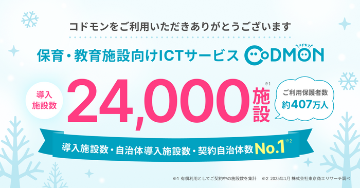 株式会社コドモン(本社:東京都品川区、代表取締役:小池義則)は、当社が展開する保育・教育施設向けICTサービス「CoDMON」(以下:コドモン)の有償利用での導入施設数が、2026年1月7日に24,000施設(※1)を超えたことをお知らせいたします。