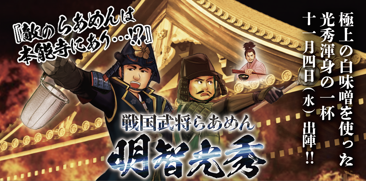 今回登場する一杯は、【戦場で『旨いらあめん』を兵士たちに振る舞い、鋭気を養ってもらうことが、戦国武将達の『ステータス』になっていた】という設定のもと、明智光秀が京都の食材を用いて作ったラーメンを開発し、ラーメンバトルに挑むというオリジナルストーリーを創作。ラーメンとエンターテイメントを融合させた一杯です。
