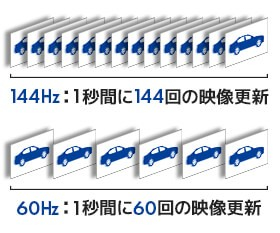 リフレッシュレート144Hz駆動の液晶モニタは、一般的な60Hz駆動の液晶モニタと比べ、より滑らかで鮮明な映像を映し出します。動きの激しいシーンでもブレが少なく、ゲームプレイ時の素早い反応を支え、プレイヤーの操作性を高めます。また、動画鑑賞や映像編集など、細かな動きの確認が求められる作業においても、高い視認性と快適な作業環境を提供します。