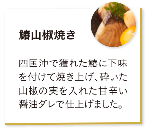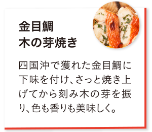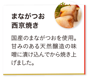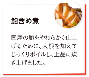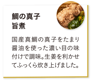 ★㉘ 冬菇椎茸旨煮 ★㉙ 鰆山椒焼き ★㉚ まながつお西京焼き ㉛ 梅肉百合根 ㉜ 金柑蜜煮 ★㉝ 金時芋レモン煮 ★㉞ 紫花豆 ★㉟ 鯛の真子旨煮 ㊱ 菜の花 ㊲ このしろ紀州和え ★㊳ 紅白柿なます ㊴ 足赤海老含め煮 ㊵ 鶏味噌松風 ㊶ 真蛸の柚子煮 ㊷ 伊達巻 ㊸ 丹波黒豆 ㊹ いくら醤油漬け ㊺ 金時芋金団 ㊻ 栗の甘露煮