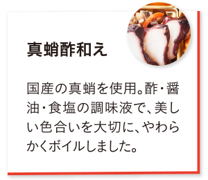 SONOKOのおせち料理は、主原料をすべてトレースの確かな国産素材を用いています。調味料や例えば「ゴマ」まで国産です。生産者や生産方法まで、そのこだわりと想いをひとつひとつ確認しています。例えばエビには、仕入が非常に不安定で流通の少ない「足赤海老」を使用するなど、素材選びにも手を抜きません。また、それぞれの素材を吟味して一番美味しく食卓にお届けできるよう調理法を工夫しています。