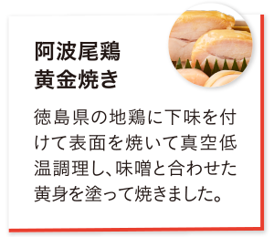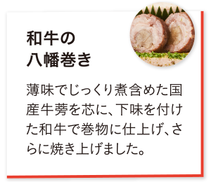 ★⑯ 阿波尾鶏黄金焼き ⑰ サーモンロール ⑱ 鶏ときのこのパテ ⑲ チキンボールトマト煮 ⑳ 豚ほほ肉の角煮 ㉑ ハムのムース ★㉒ 和牛の八幡巻き ★㉓ みやじ豚の塩麹漬焼き ㉔ 帆立のクリームソース ★㉕ みやじ豚の和風ミートローフ ㉖ 穴子巻き ㉗ 胡桃の飴炊き