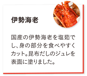 ① 鶏味噌松風 ★② 鰆山椒焼き ★③ 金目鯛木の芽焼き ④ 金柑蜜煮 ★⑤ まながつお西京焼き ⑥ 梅肉百合根 ★⑦ 紫花豆 ★⑧ 伊勢海老 ★⑨ 鮑含め煮 ★⑩ 炙り栗の甘露煮 ⑪ このしろ紀州和え ★⑫ 真蛸酢和え ⑬ 伊達巻 ⑭ いくら醤油漬け ★⑮ 帆立のやわらか煮