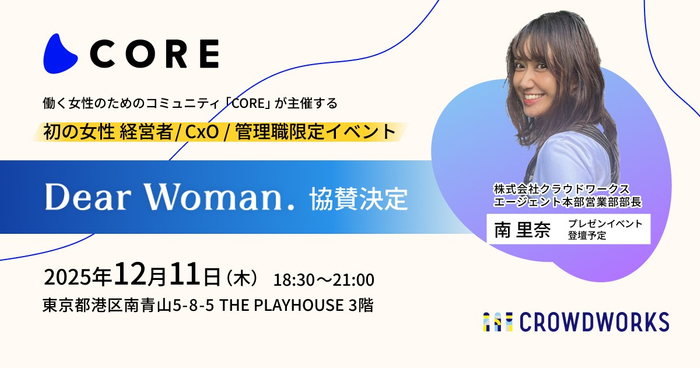 フリーランス業界最大級プラットフォーム(登録ワーカー含む登録ユーザー数700万人・登録企業100万社)を基盤に、IT人材&DXコンサルティングサービスを提供する株式会社クラウドワークス(本社:東京都港区、代表取締役社長 兼 CEO:吉田 浩一郎 以下「当社」)が運営する、即戦力IT人材のダイレクトマッチングサービス「テックダイレクト」は、2025年12月11日(木)に開催された、働く女性のためのコミュニティ「CORE」主催の企画「Dear Woman.」に協賛し、クラウドワークス エージェント本部 営業1部 部長 兼 テックダイレクト事業責任者の南 里奈が登壇しました。