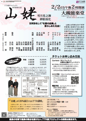 TTR能プロジェクト主催、2025新春公演『山姥』が2025年2月2日 (日)に大槻能楽堂(大阪府 中央区 上町 A-7)にて上演されます。チケットはカンフェティ(運営:ロングランプランニング株式会社、東京都新宿区、代表取締役:榑松 大剛)にて2024年12月2日(月)10:00より予約受付開始です。
