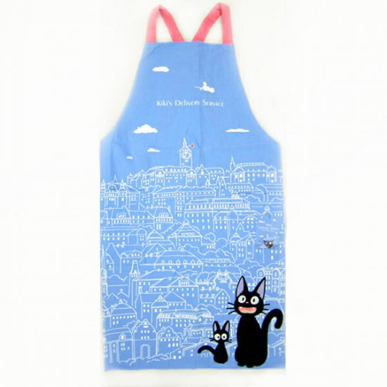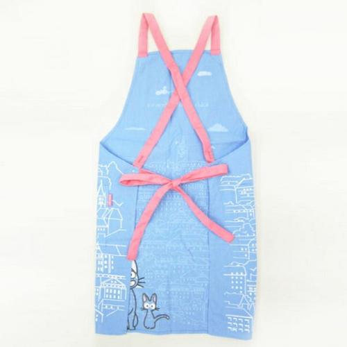 水色とピンクが爽やかなエプロンです。エプロンにはコリコの街が描かれています。白い雲と一緒にキキも空を飛んでいるという、なんとも爽やかなデザイン♪水色の背景に対して、黒いジジがとっても映えています。