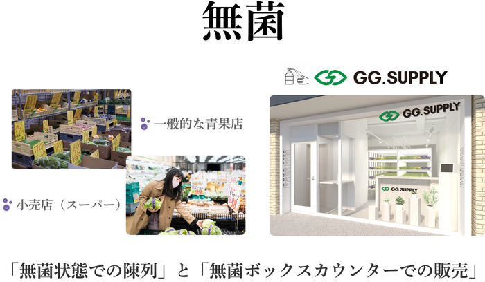 既存の一般的な青果店・小売店(スーパー)は包装無しでの路面陳列・露出にて不衛生な現状があります。私達は無菌環境にて野菜を徹底的に衛生管理することでそれらの問題を解決します。