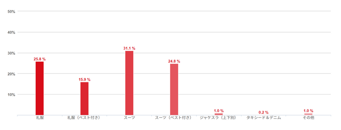 礼服(ベスト付き)が38.7%と最も高く、ベスト無しの礼服を含めると約6割を占める。