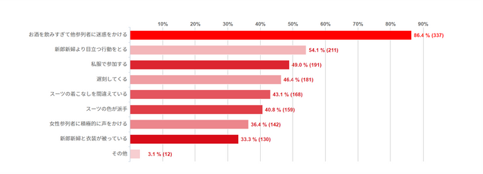 他人への迷惑行為が上位であがる一方で、スーツの着こなしや色柄など服装に関する回答も比較的多くみられる。
