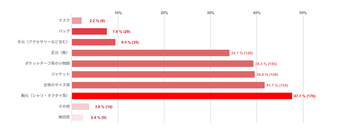 胸元(シャツやネクタイ等)が47.7%と最も高く、次いで全体のサイズ感(41.7%)、ジャケット(39.6%)、ポケットチーフ等の小物類(39.3%)と続く。