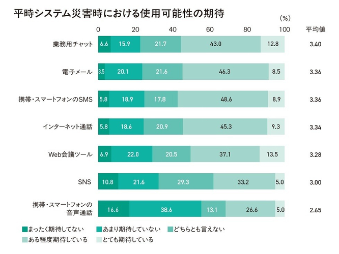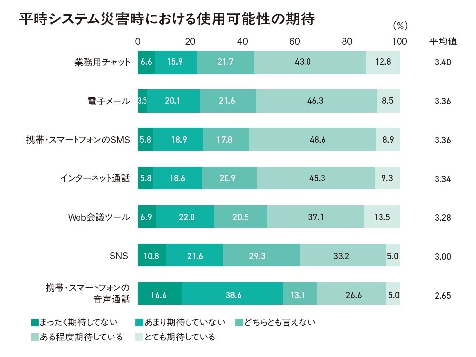 アンケートでは、普段使っているメールやオンライン会議システム、SNS などの通信手段について、災害時にどの程度利用できると期待しているかも尋ねた。