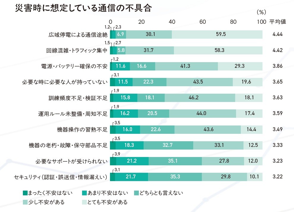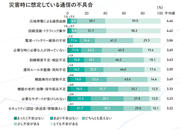 このほか、災害時に想定しているさまざまな通信の不具合についても、1「まったく不安はない」〜 5「とても不安がある」の5 段階で聞いたところ、「広域停電による通信途絶」(平均点4.44)と「回線混雑・トラフィック集中」(4.42)は突出して高い数値となった。過去の災害で繰り返し指摘されてきたことから、企業の担当者の間で強くイメージが定着しているものと推測できる。