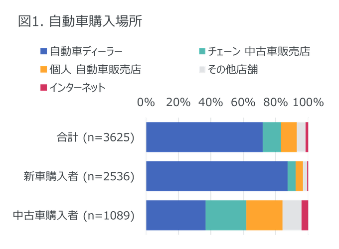 自動車の購入場所として最も多かったのは自動車ディーラーで72%を占めた(図1)。中古車購入者ではその割合は37%にとどまり、チェーンの中古車販売店(25%)や個人の自動車販売店(22%)など、自動車ディーラー以外の販売店が過半を占めた。その店舗で購入した理由については、自動車ディーラー、チェーンの中古車販売店では「欲しい車があったから」が最も多く、それぞれ35%、31%であった。またチェーンの中古車販売店では「車の価格が安かったから」との回答が27%と2番目に多く、価格面も重視されていることがうかがえる。個人の自動車販売店では「車の価格が安かったから」が23%、「いつも使っている店だから」が22%とほぼ同数であり、価格だけではなくその店の馴染みがあることがポイントといえそうだ。