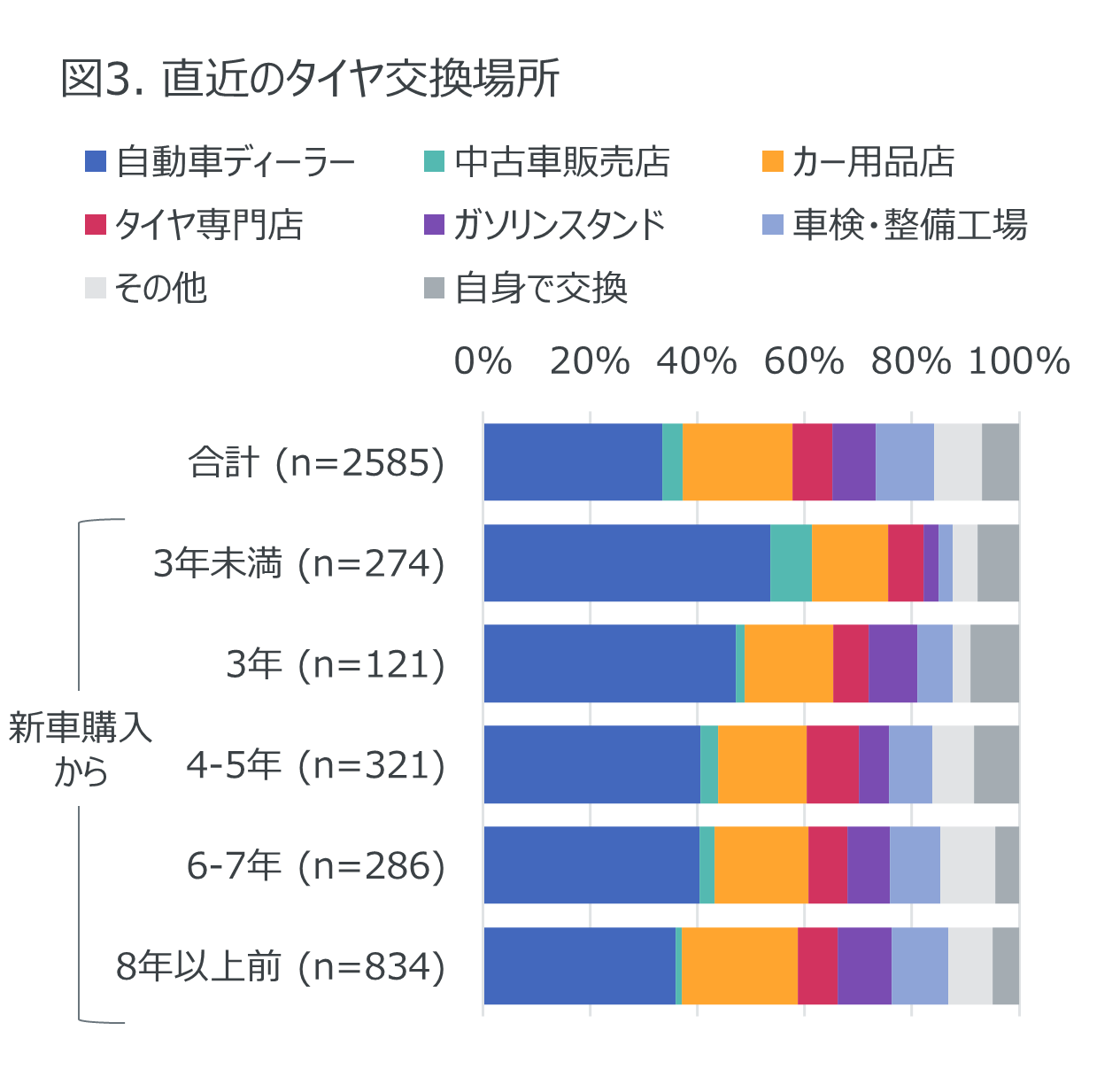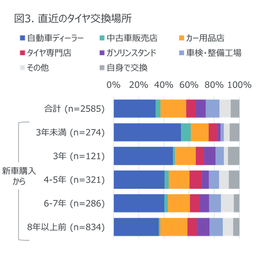 タイヤ・エンジンオイル・バッテリー交換で共通する特徴として、自動車の購入から年月が経つと自動車ディーラーから他の販売店に移行することが挙げられる。直近のタイヤ交換は、新車購入から3年未満ではディーラーが54%と半数を超えたが、8年以上前では36%にとどまった(図3)。ディーラーからの移行先としてはカー用品店が多く、新車購入から3年未満では14%であったものの、8年以上前では22%に達した。なお中古車で購入から7年以上経過した場合は、カー用品店との回答が31%と最も多く、自動車ディーラー(12%)を大きく上回った。