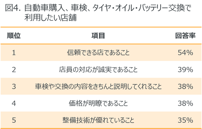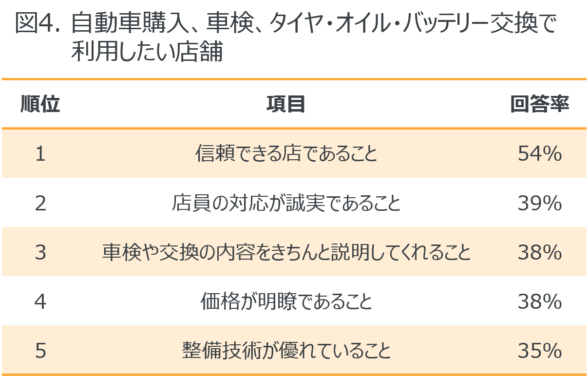 ・ 自動車購入、車検、タイヤ・エンジンオイル・バッテリー交換で利用したい店舗は「信頼できる店」が最も高く54%。