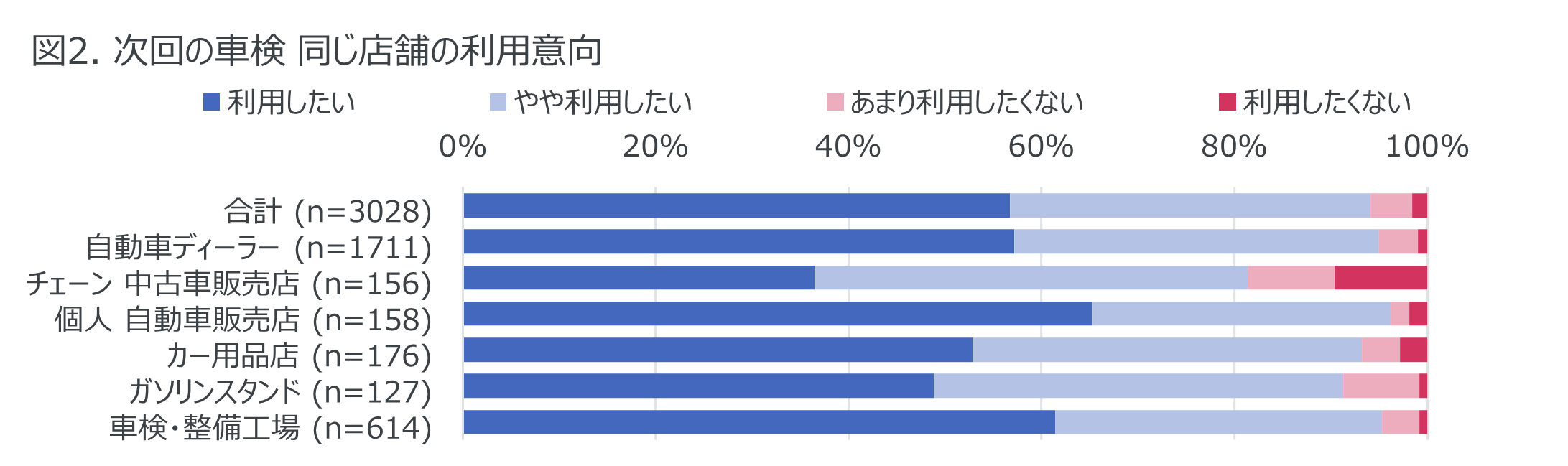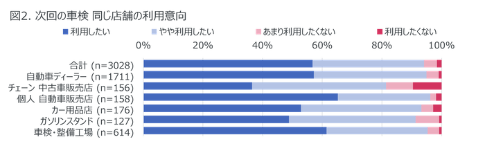 直近で車検を実施した場所について調査したところ、回答者3,028人のうち57%が自動車ディーラーと最も多く、次いで20%が車検・整備工場、6%がカー用品店であった。その店舗で車検を実施した理由については、自動車ディーラーで多く挙げられたのは「その店舗で車を購入したから(36%)」であったことに対し、車検・整備工場では「いつも使っている店舗だから(37%)」「費用が安かったから(35%)」であった。またカー用品店やガソリンスタンドでは「費用が安かったから」との回答が多くそれぞれ50%、61%と半数を超えた。加えて「自宅から近かったから」がカー用品店では37%、ガソリンスタンドでは43%であったことから、カー用品店やガソリンスタンドでは費用と立地の側面が重視されているといえる。次回の車検でも同じ店舗を利用したいか聞いたところ「利用したい」との回答は全体では57%で、特に個人の自動車販売店では65%、車検・整備工場では61%に達した(図2)。