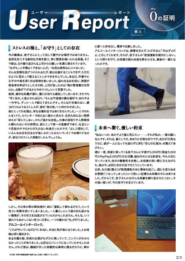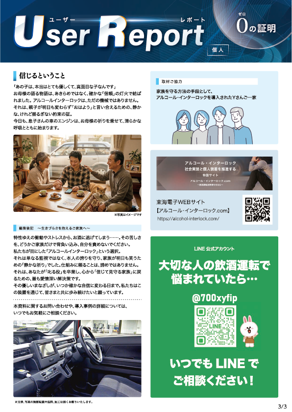 今回公開した事例では、「信じて見守る」という選択のもと、アルコール・インターロックを導入することで、家族の負担に依存しないかたちで再発防止に取り組む姿が描かれています。飲酒問題への対応が個人や家族の努力だけに委ねられがちな中で、本事例は新たな向き合い方の一例を示すものです。本取り組みは、実際の利用者の声を通じて、飲酒運転防止の具体的な手段を広く社会に発信することを目的としています。