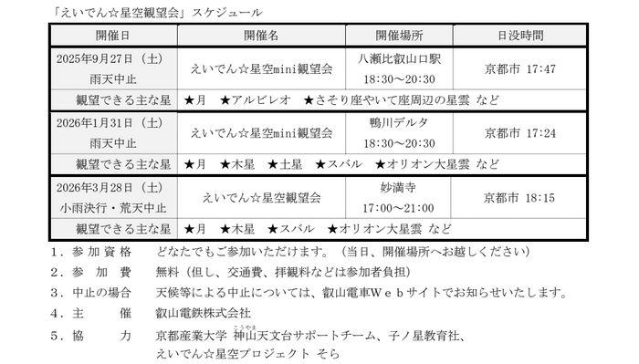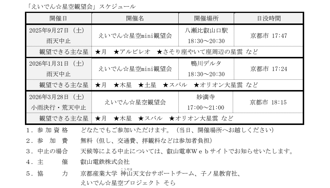 叡山電鉄株式会社(本社:京都市左京区、社長:豊田秀明)では、星空観望企画「えいでん☆星空観望会」の今年度のスケジュールを決定しましたのでお知らせいたします。