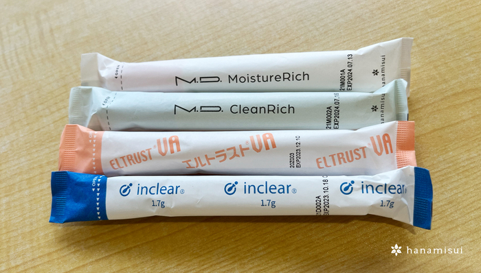 お配りした商品サンプル: 手前から、インクリア、エルトラストVA、M.D.シリーズ2種